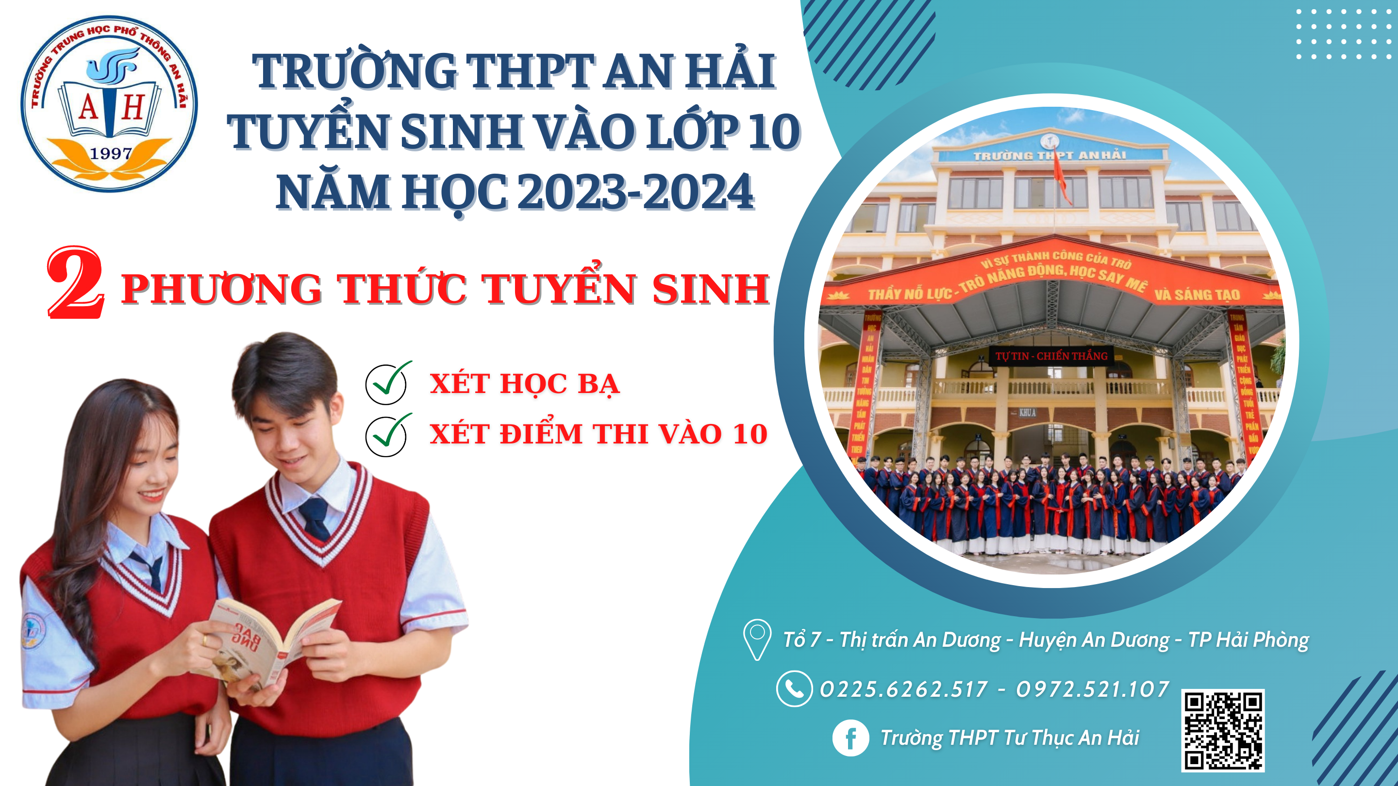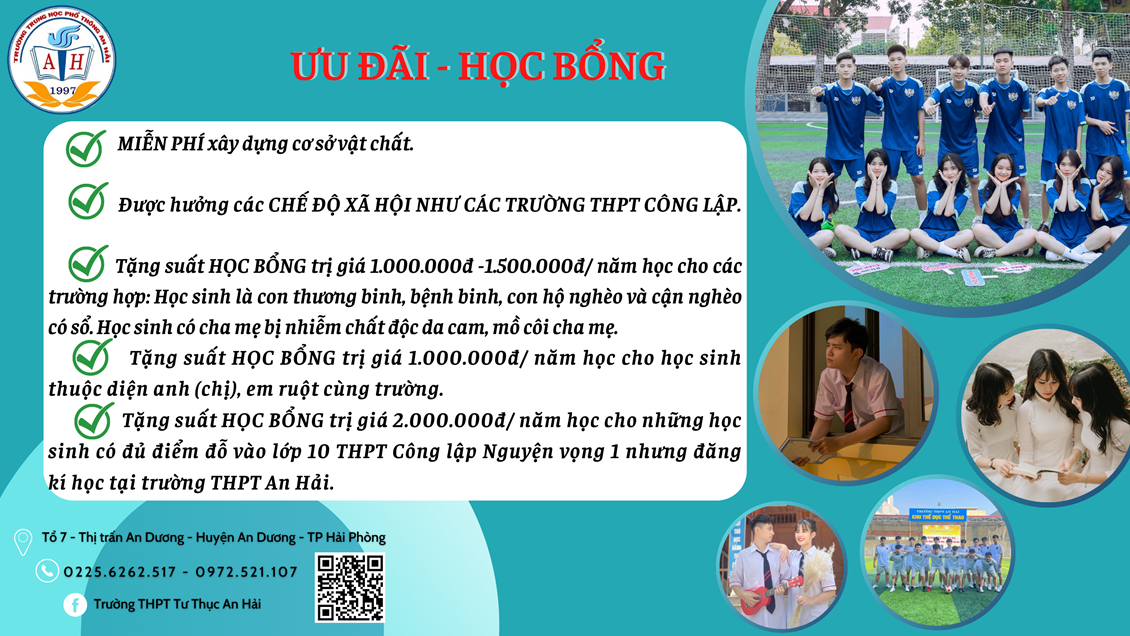 Với phương thức xét tuyển Học bạ THCS đơn giản, thủ tục nhanh chóng, nhận kết quả sớm, hãy nhanh tay tìm hiểu về trường THPT An Hải và đăng kí sớm để trở thành những tân học sinh khóa K26 của nhà trường.